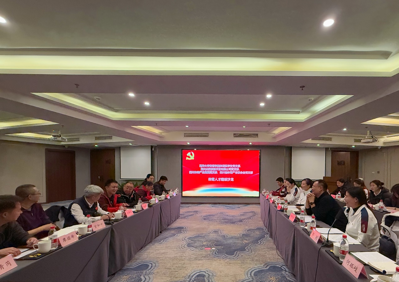 当晚举办的体育人才建设沙龙将活动推向高潮。来自产业界的精英与高校师生齐聚一堂,围绕体育人才成长路径、校企资源整合、体育产业新质生产力等议题展开热烈交流。四川体育产业集团饶青芮、廖诺希、陈丽等分享跨界经验与职业建议;联合会常务副秘书长官和平强调复合型人才培养的重要性;四川省体育产业联合会党支部书记、省体育局原二级巡视员周凯对体育金融人才的需求提出了展望;西华大学姚志媛老师与学生党员何珏岐则从党建引领角度,探讨如何推动党建与业务深度融合、践行体育强国使命;学院党委副书记钟灵波和四川省体育产业集团党支部书记、总经理林继华则分别从党建引领、人才培养、产业发展、校企共建等方面作了总结发言。